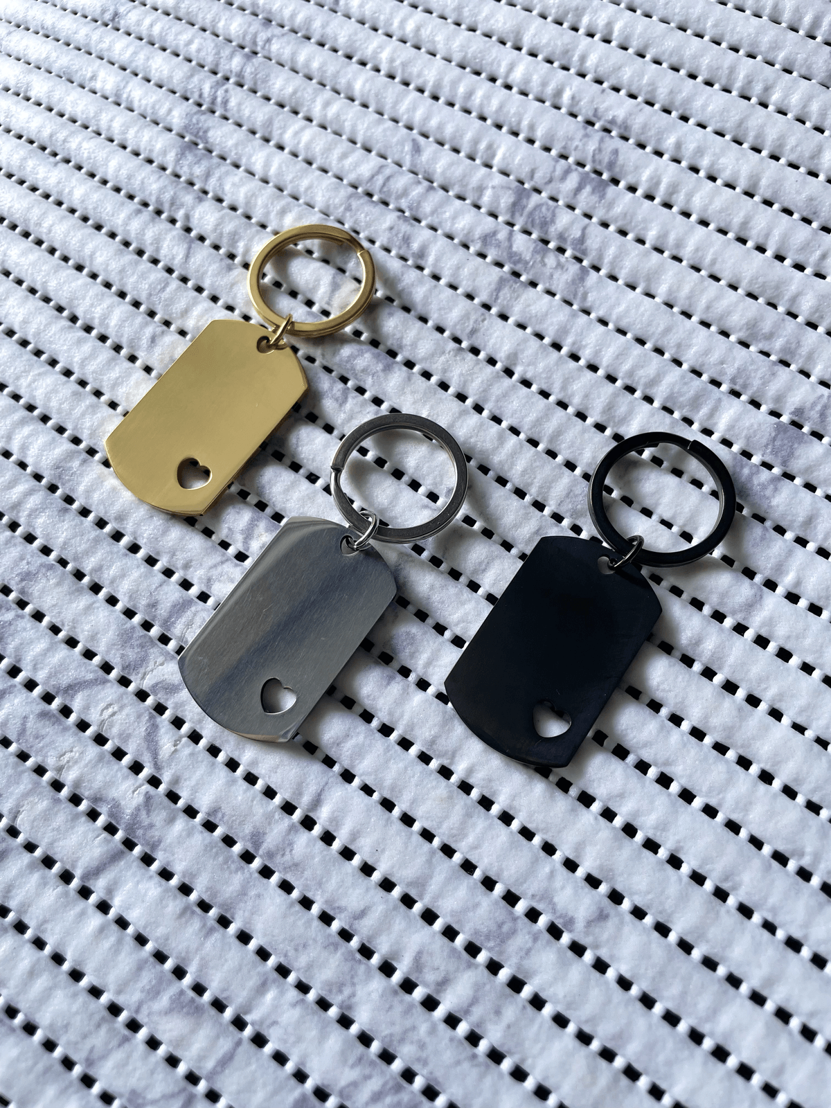 Es un accesorio que combina elegancia, personalización y un toque de amor. Este llavero está diseñado con una placa rectangular de estilo minimalista, que en su esquina lleva un corazón, es perfecto para personalizarlo con un nombre, una fecha especial o un mensaje significativo.