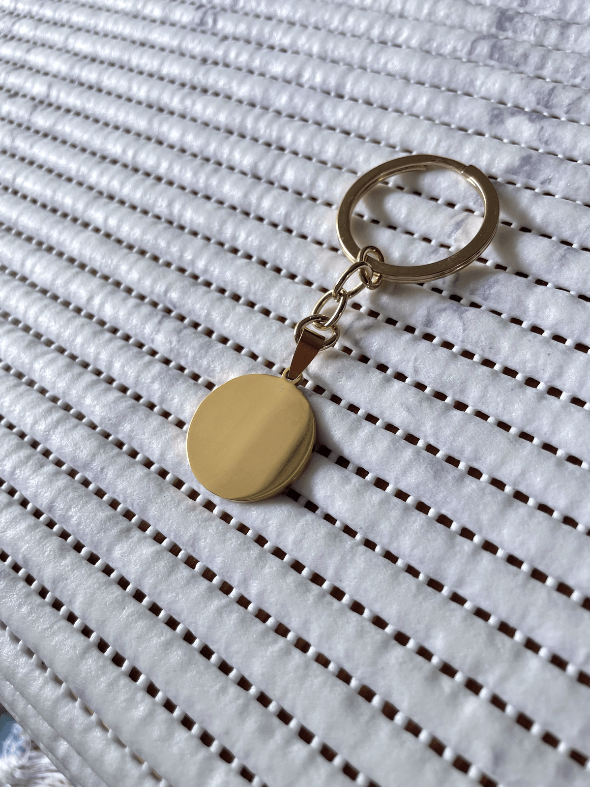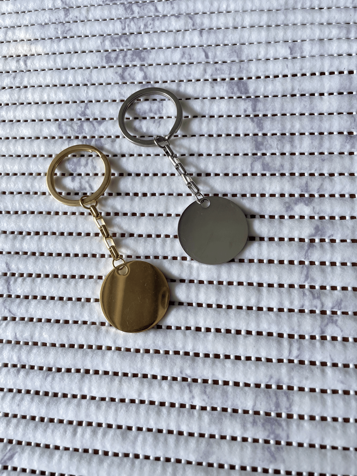 Es un accesorio que combina elegancia, personalización y un toque de amor. Este llavero está diseñado con una placa circular de estilo minimalista, es perfecto para personalizarlo con un nombre, una fecha especial o un mensaje significativo.